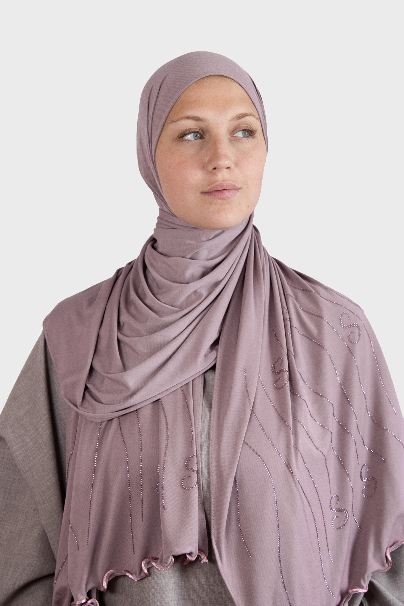 Le voile jersey premium avec strass allie élégance et originalité avec son tissu jersey premium doux et confortable. Son design unique se distingue par un grand « S » placé près de la finition, représentant la signature de Saphir Boutique. Le détail en zigzag apporte une touche d'originalité, tandis que les perles en forme de vagues viennent sublimer le voile. Léger et fluide, il offre un confort optimal tout en rehaussant votre tenue d’un détail chic et contemporain.