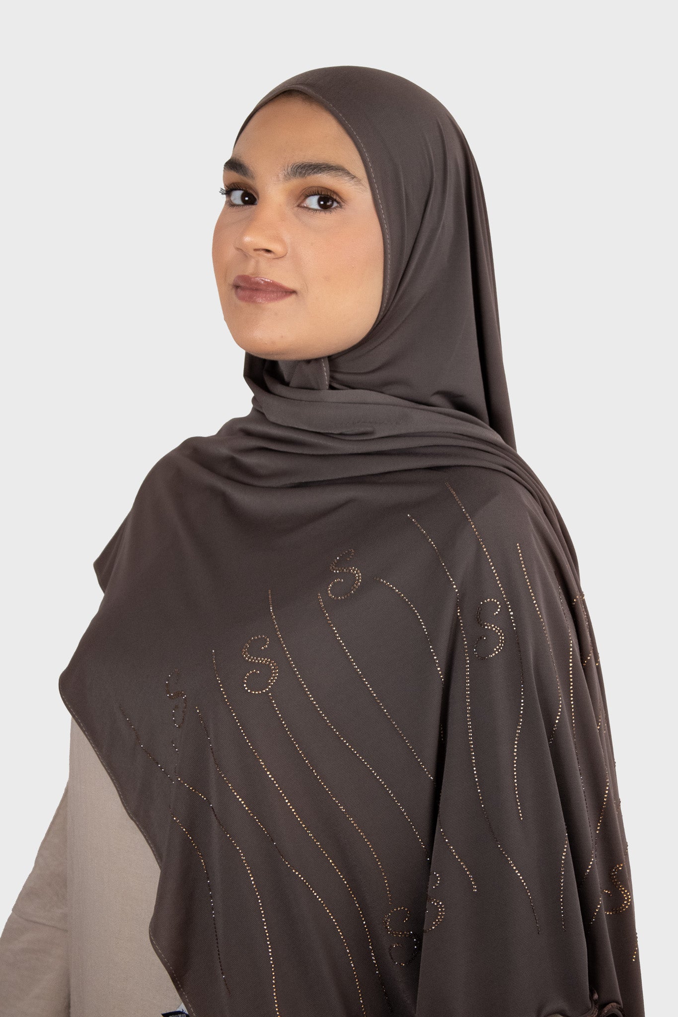 Le voile jersey premium avec strass allie élégance et originalité avec son tissu jersey premium doux et confortable. Son design unique se distingue par un grand « S » placé près de la finition, représentant la signature de Saphir Boutique. Le détail en zigzag apporte une touche d'originalité, tandis que les perles en forme de vagues viennent sublimer le voile. Léger et fluide, il offre un confort optimal tout en rehaussant votre tenue d’un détail chic et contemporain.