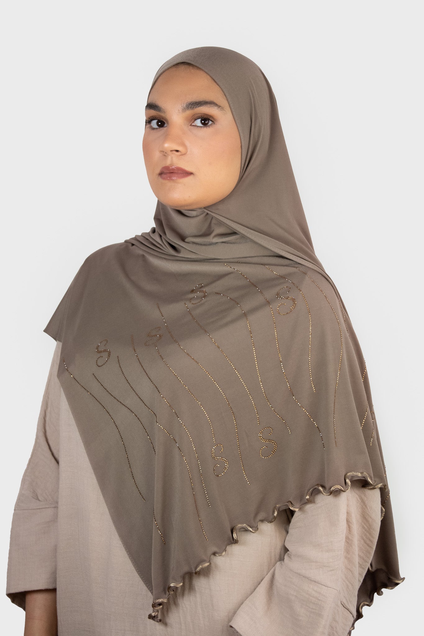 Le voile jersey premium avec strass allie élégance et originalité avec son tissu jersey premium doux et confortable. Son design unique se distingue par un grand « S » placé près de la finition, représentant la signature de Saphir Boutique. Le détail en zigzag apporte une touche d'originalité, tandis que les perles en forme de vagues viennent sublimer le voile. Léger et fluide, il offre un confort optimal tout en rehaussant votre tenue d’un détail chic et contemporain.