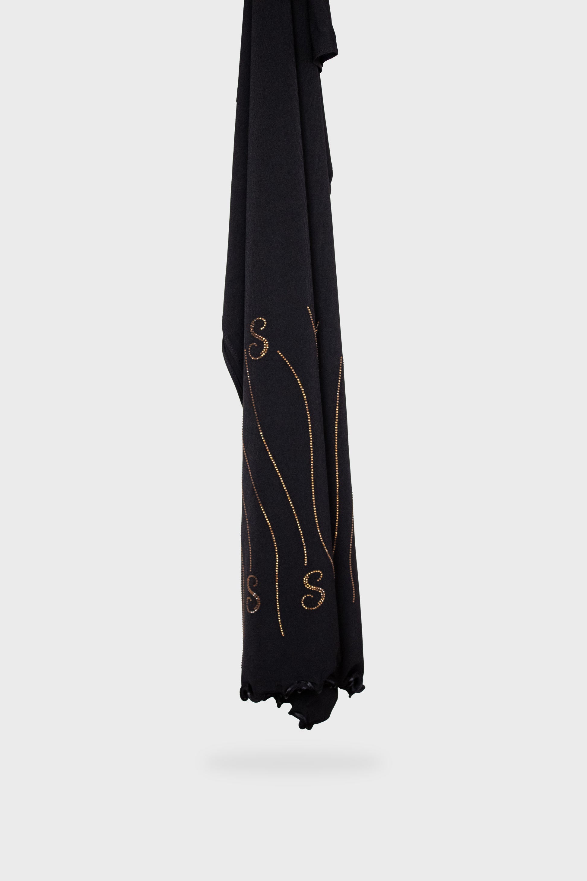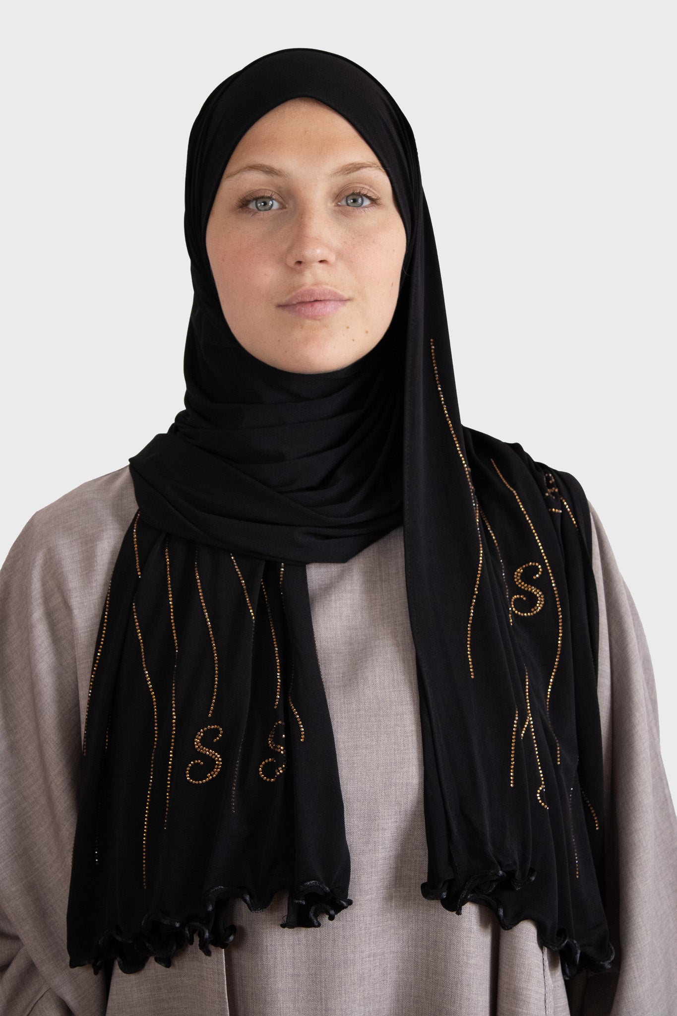 Le voile jersey premium avec strass allie élégance et originalité avec son tissu jersey premium doux et confortable. Son design unique se distingue par un grand « S » placé près de la finition, représentant la signature de Saphir Boutique. Le détail en zigzag apporte une touche d'originalité, tandis que les perles en forme de vagues viennent sublimer le voile. Léger et fluide, il offre un confort optimal tout en rehaussant votre tenue d’un détail chic et contemporain.