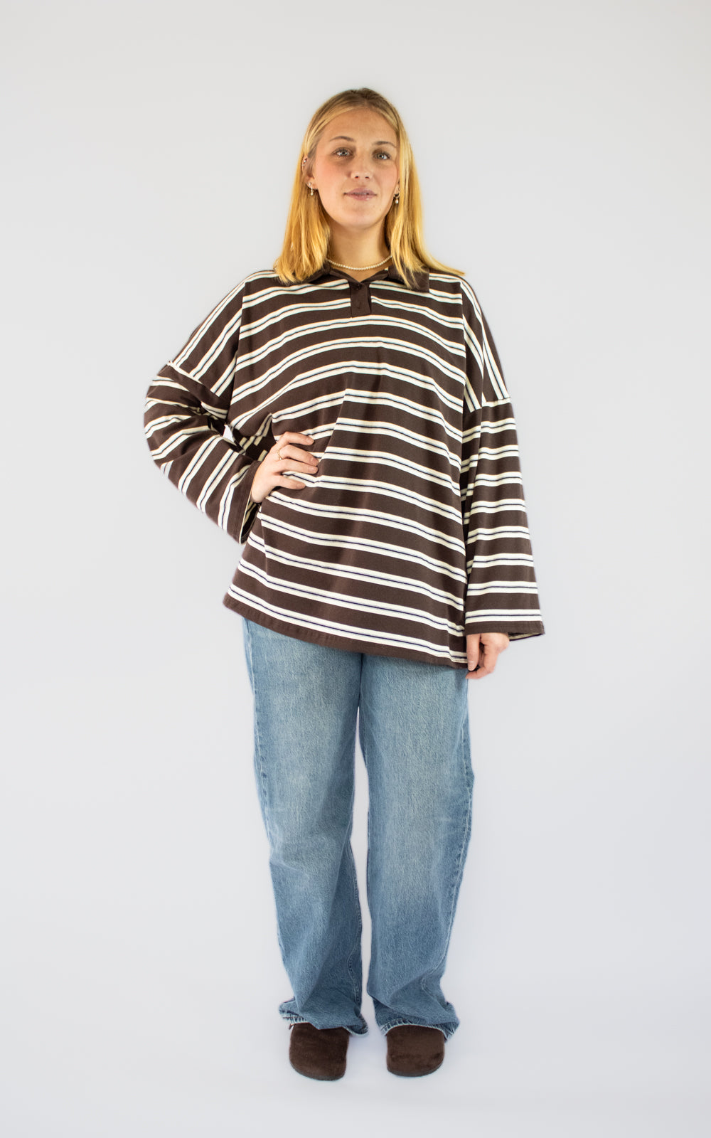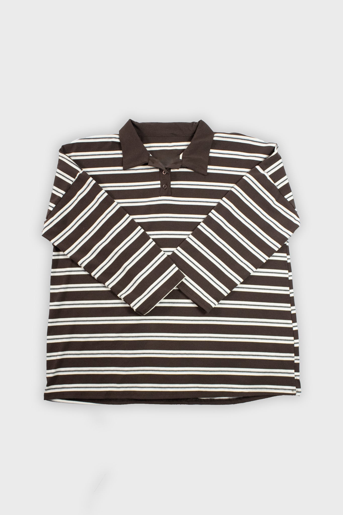 Ce haut rayé marron à coupe ample apporte une touche décontractée et moderne à votre look. Confectionné en 95% coton et 5% élasthanne, il est doux, respirant et agréable à porter. Ses manches larges et son col boutonné ajoutent un esprit casual parfait pour le quotidien.