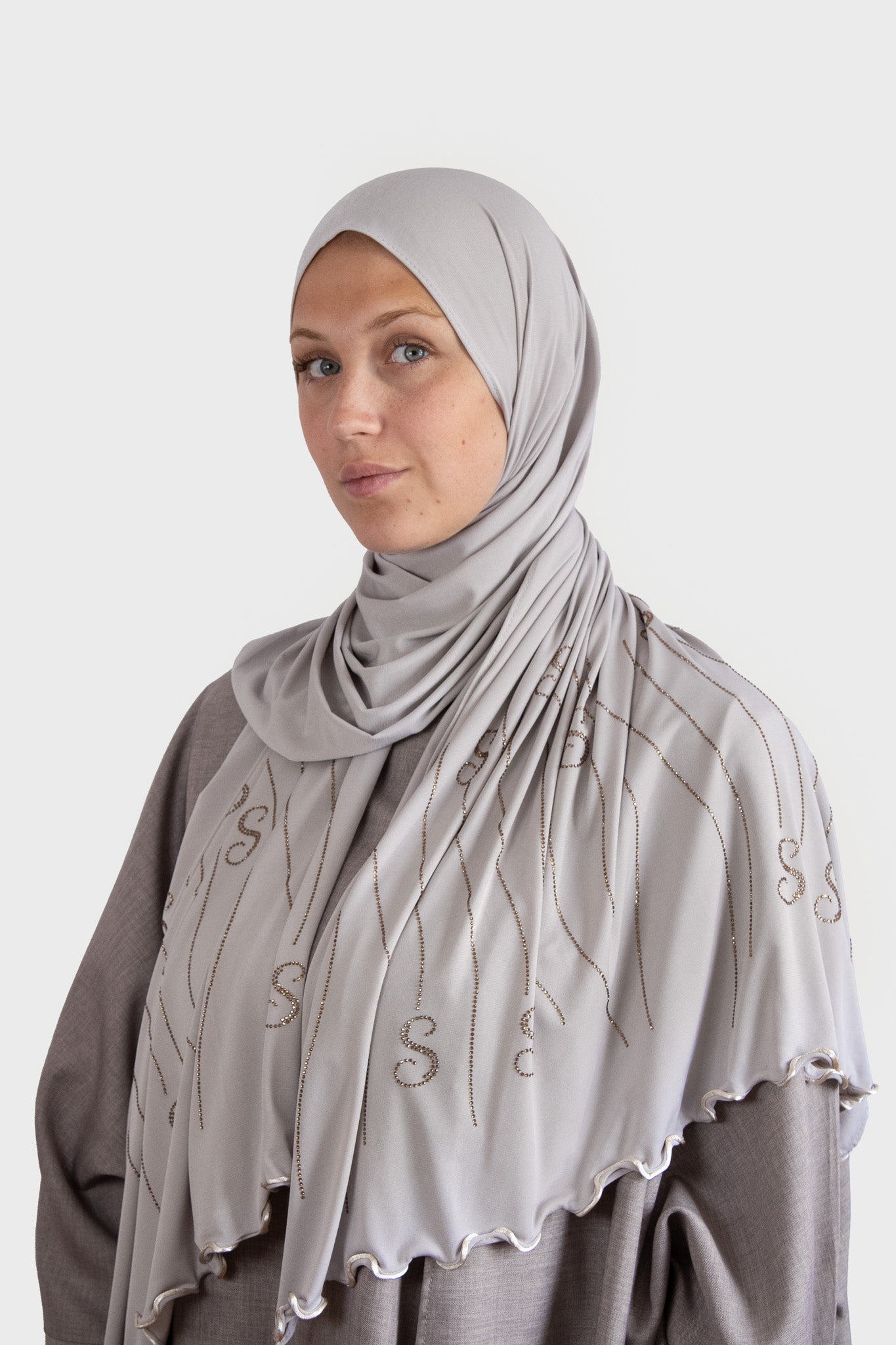 Le voile jersey premium avec strass allie élégance et originalité avec son tissu jersey premium doux et confortable. Son design unique se distingue par un grand « S » placé près de la finition, représentant la signature de Saphir Boutique. Le détail en zigzag apporte une touche d'originalité, tandis que les perles en forme de vagues viennent sublimer le voile. Léger et fluide, il offre un confort optimal tout en rehaussant votre tenue d’un détail chic et contemporain.
