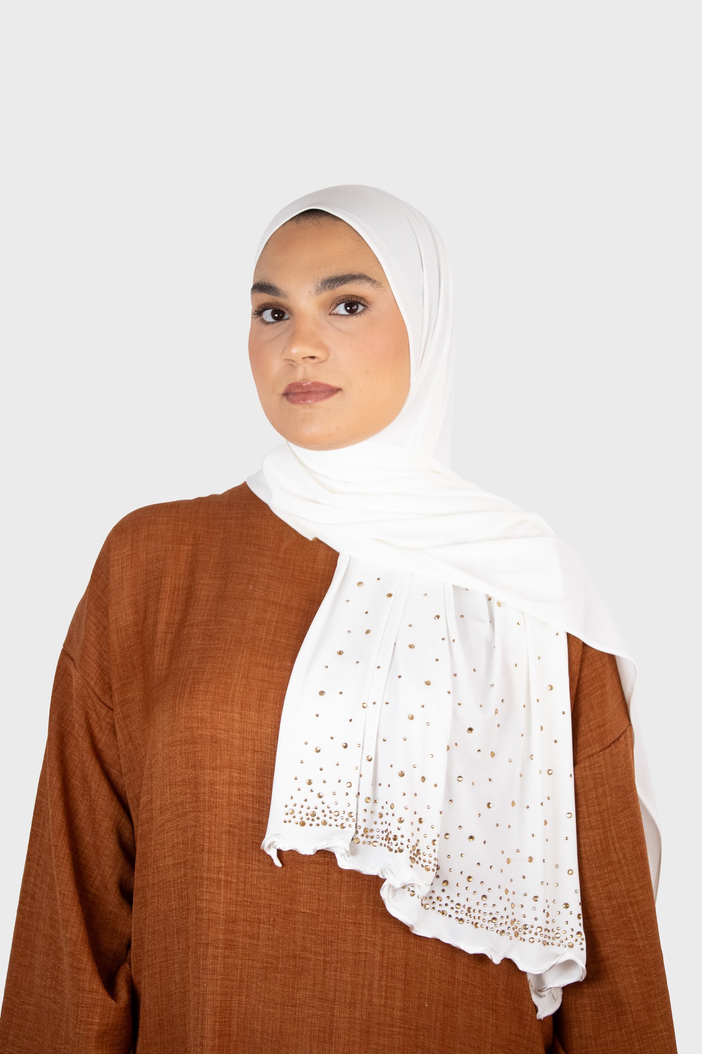 Le voile jersey premium avec perles allie confort et raffinement. Son tissu jersey premium doux et extensible assure une tenue agréable et légère. Le motif zigzag subtil apporte une touche graphique élégante, tandis que les perles délicates disposées en dégradé viennent sublimer le bas du voile avec finesse. Léger et fluide, ce voile est idéal pour celles qui recherchent une élégance quotidienne sans compromis sur le confort.
