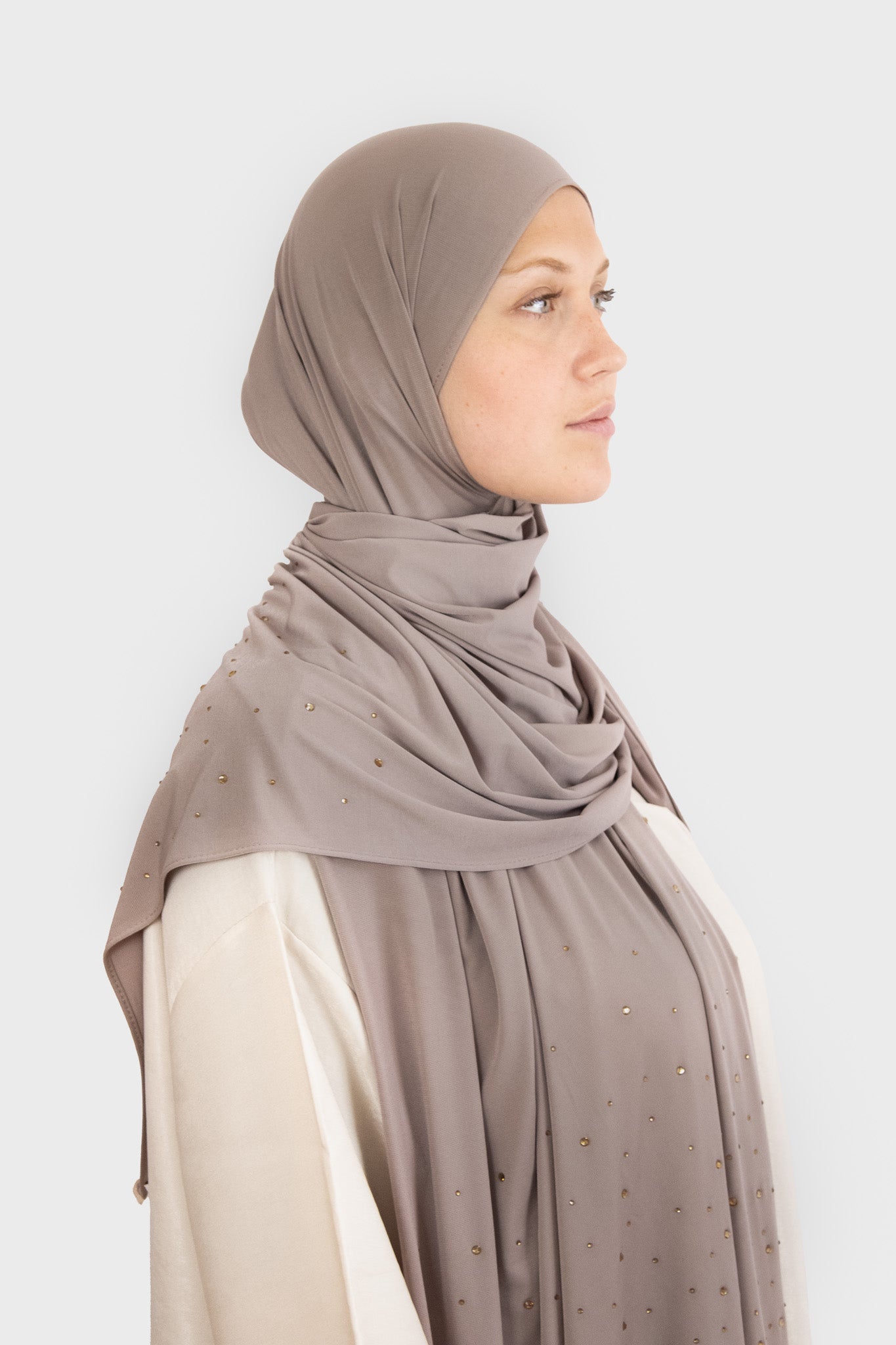 Le voile jersey premium avec perles allie confort et raffinement. Son tissu jersey premium doux et extensible assure une tenue agréable et légère. Le motif zigzag subtil apporte une touche graphique élégante, tandis que les perles délicates disposées en dégradé viennent sublimer le bas du voile avec finesse. Léger et fluide, ce voile est idéal pour celles qui recherchent une élégance quotidienne sans compromis sur le confort.